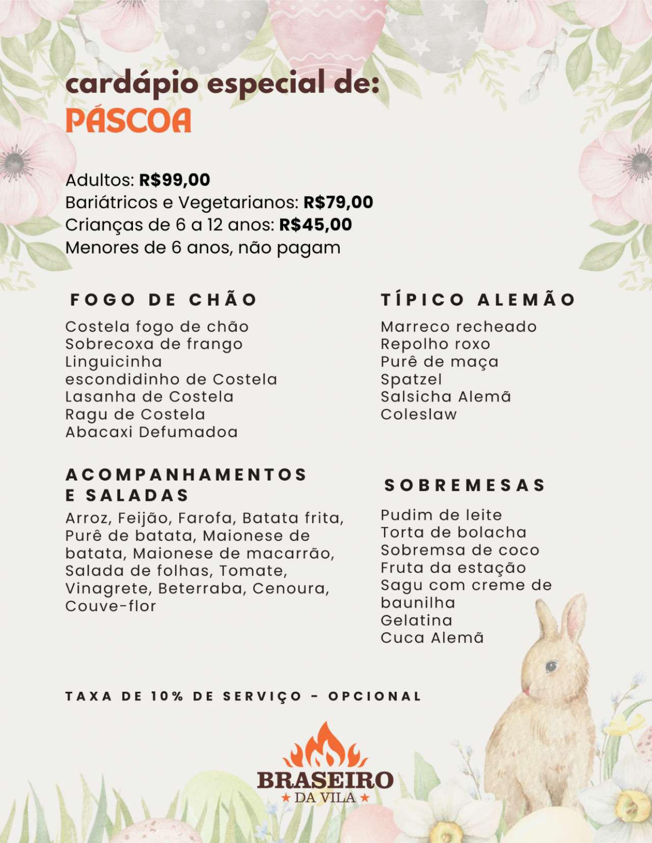 Cardápio com Costela Fogo de Chão, Marreco Recheado, Sobrecoxa assada, Linguicinha, Salsicha Alemã.